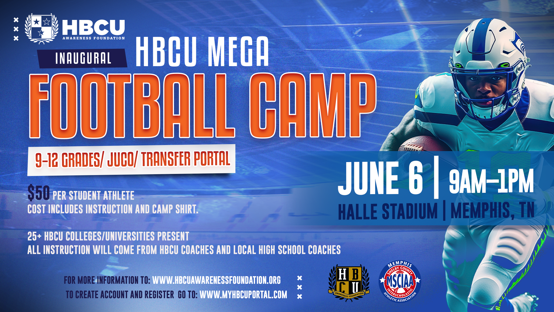 HBCU Awareness Foundation presents the Inaugural HBCU Mega Football Camp, Saturday June 6, 2026, from 9am-1pm at Southwind High School in Memphis, TN